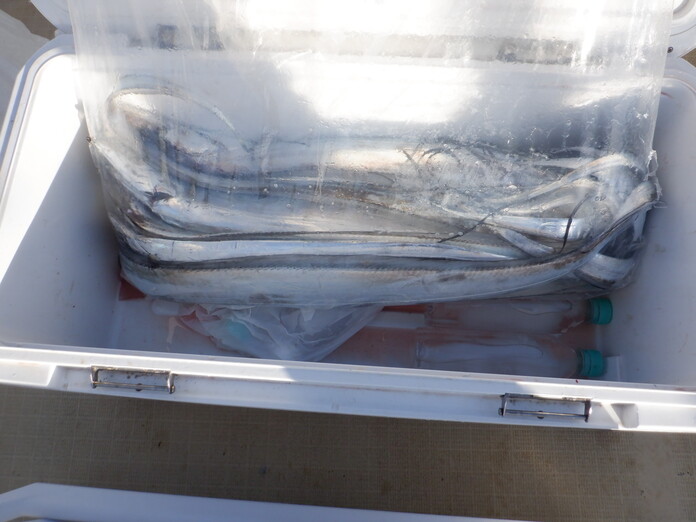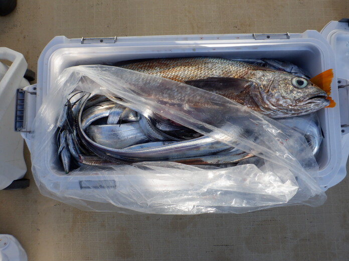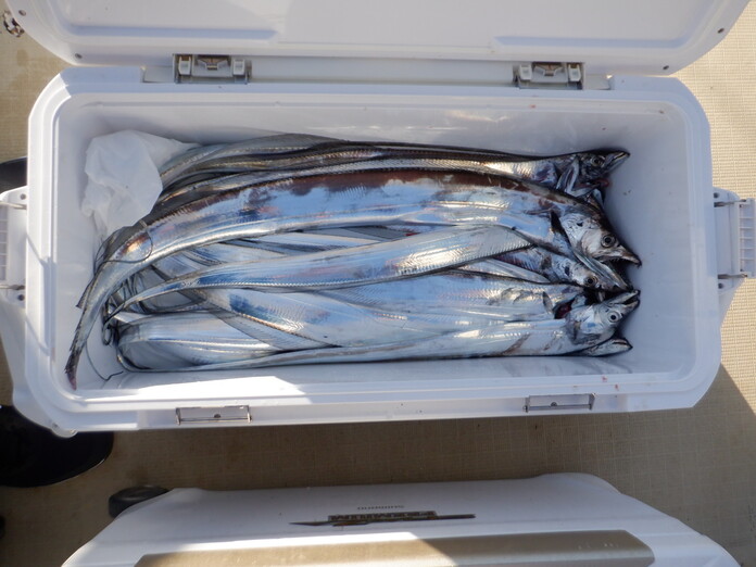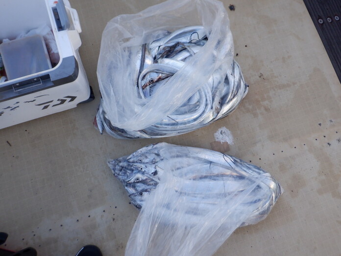 今年の太刀魚は過去の全盛期が蘇る状況です。反応も良くあたりは続き一人40匹前後と好調でサイズはF3~F6迄が上って来ました。。