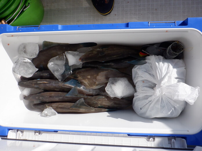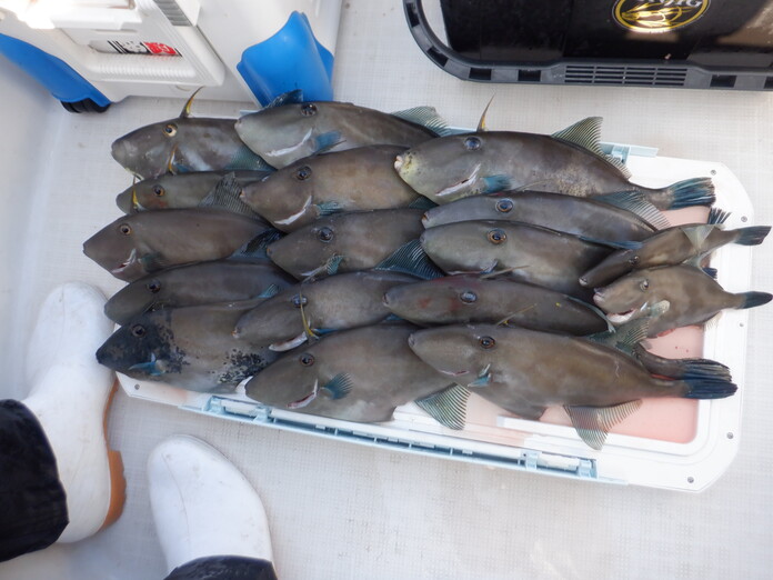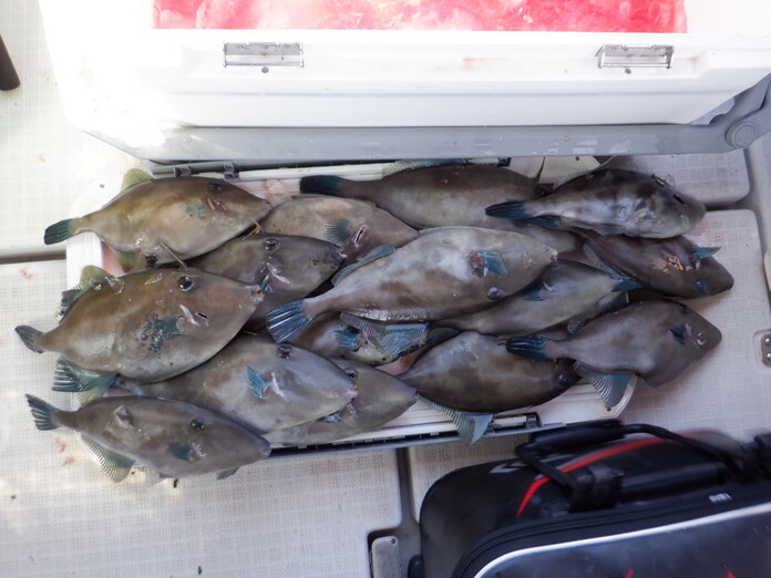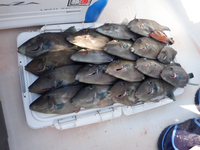 <1月17日 ウマズラハギ> 今日はウマズラがターゲットです。一日を通して順調に上がりました。流石にエサ取りが上手く、一筋縄では行きませんがトップ20匹超えで釣果は纏まりました。他の方も二桁釣果で納竿となりました。